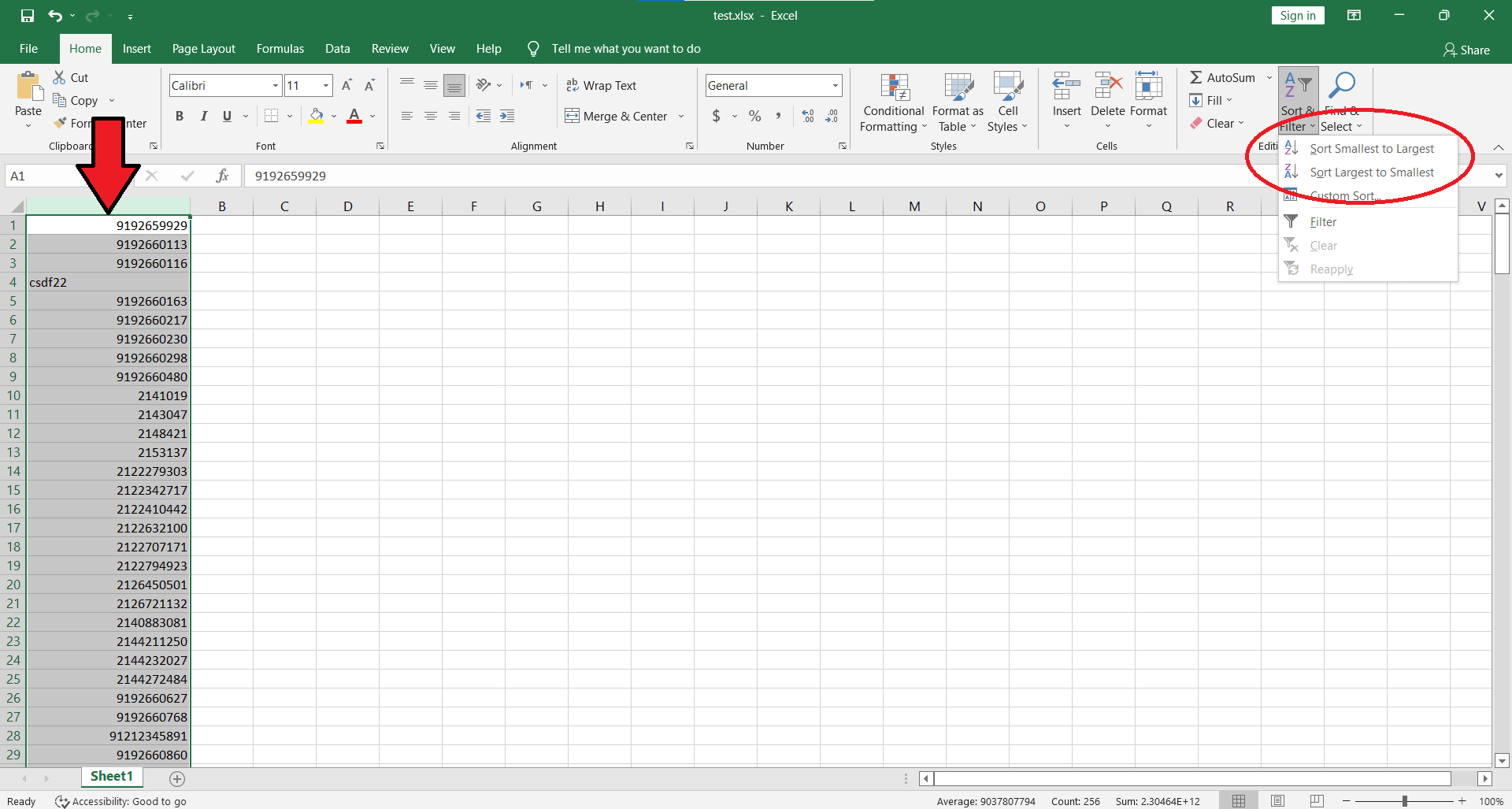 در لیستی که باز می شود دو گزینه وجود دارد که شماره های موجود در آن ستون را به ترتیب کوچک به بزرگ و یا از بزرگ به کوچک مرتب میکند.