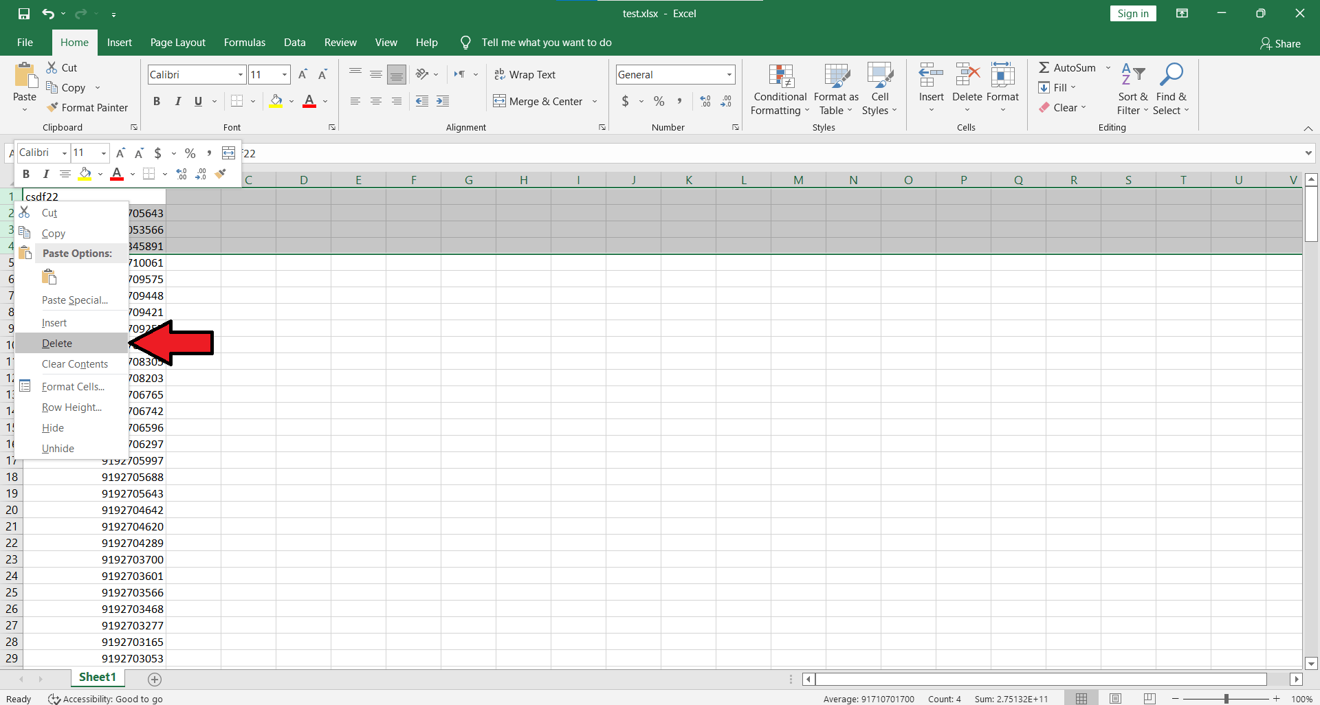 سپس بر روی قسمتی که انتخاب شده کلیک راست کرده و گزینه Delete را انتخاب می کنید تا این شماره های خراب پاک شوند .