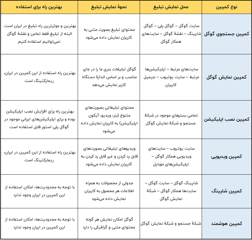 در نهایت اگر بخواهیم یک جمع بندی از موارد گفته شده داشته باشیم، میتوانیم از جدول زیر استفاده کنیم. ما در این جدول، بطور مختصر و مفید کاربرد هر کدام از کمپین ها را با توجه به شرایط و محدودیت های ایران ارائه داده ایم تا شما خیلی سریع بتوانید کمپین مناسب خودتان را انتخاب کنید.