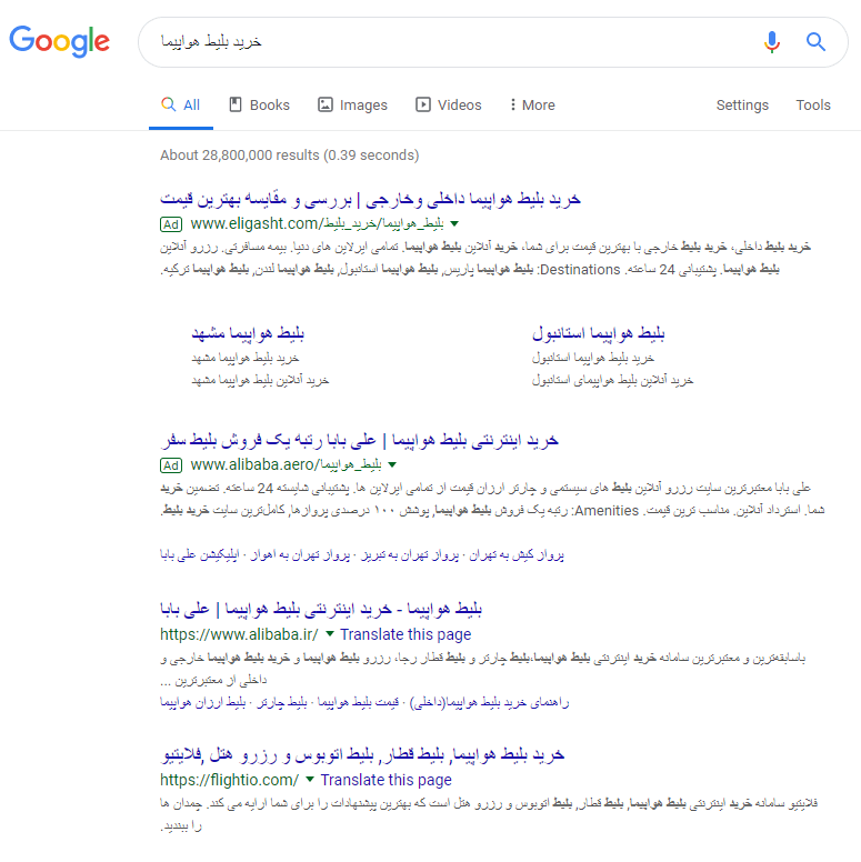همانطور که در شکل زیر مشاهده میکنید، کاربر در سایت گوگل عبارت «خرید بلیط هواپیما» را جستجو کرده و گوگل در نتایج جستجو، تبلیغ دو سایت الی گشت و علی بابا را به او نمایش میدهد. این دو تبلیغ با علامت Ad از سایر نتایج جستجو (که بصورت طبیعی و با استفاده از سئو نمایش داده میشوند)، متمایز شده اند.