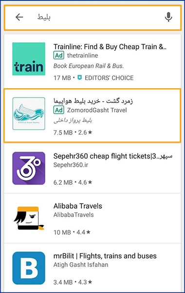احتمالاً برای شما هم پیش آمده که نام اپلیکیشنی را در گوگل پلی استور جستجو کرده باشید. با توجه به جستجوی شما، گوگل اپلیکیشن های مرتبط را هم تحت عنوان تبلیغ به شما نمایش میدهد. همانطور که در تصویر زیر مشاهده میکنید، کاربر پس از جستجوی عبارت «بلیط» در پلی استور گوگل، اپلیکیشن های مرتبط با این عبارت جستجو شده را با علامت Ad مشاهده میکند.
