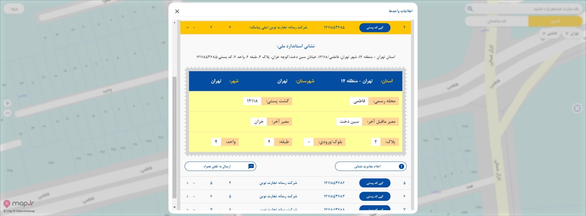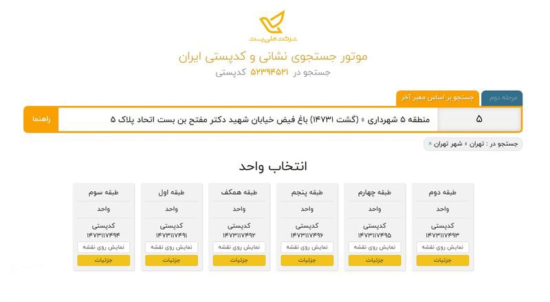 در آخر وقتی که ساختمان مورد نظرتان را انتخاب و بر روی پبلاک آن کلیک کنید، صفحه ای برای شما باز میشود که حاوی آدرس دقیق مکان انتخابی شماست. برای دستیابی به کد پستی باید گزینه «اطلاعات واحدها» را انتخاب و کد امنیتی که به شماره موبایل شما پیامک میشود را وارد کنید. سپس کد پستی تمام واحد های آن ساختمان برای شما به نمایش در میآید.