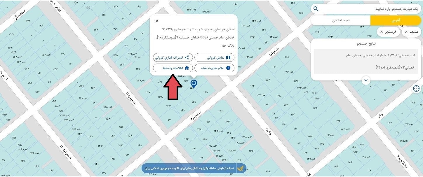 در این قسمت اگر ملک شما ویلایی باشد، فقط همان ملک شما را نشان میدهد. اما اگر برج یا آپارتمان باشد، هر واحد به تفکیک کد پستی مطابق عکس زیر نشان داده میشود. بنابراین با این روش میتوانید به آسانی کد پستی منزل خود را به پیدا کنید.