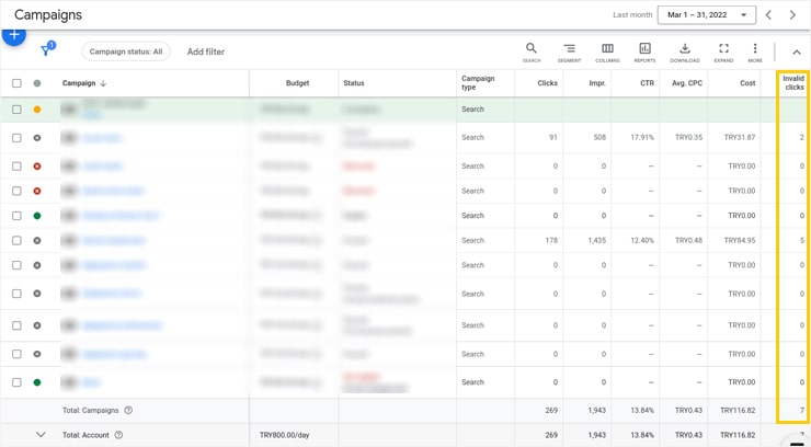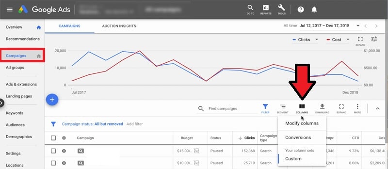 با توجه به آموزش تصویری، برای بررسی invalid clicks میتوانید کمپین مورد نظر خود را انتخاب کرده و سپس از قسمت columns گزینه modify columns را انتخاب کنید.