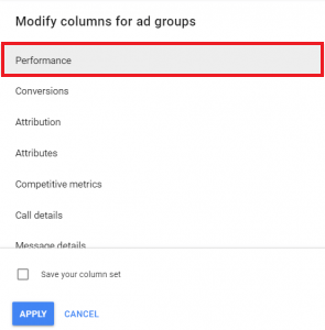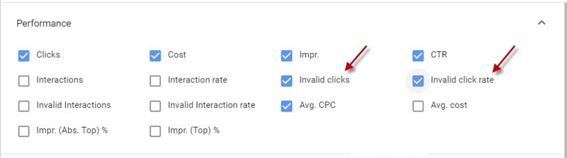 در پنجره باز شده میتوانید دادههایی که میخواهید برای شما نمایش داده شود را انتخاب کنید. دقت کنید اگر اکانت شما تازه راه اندازی شده باشد ممکن است گزینه invalid clicks موجود نباشد، چون هنوز کلیک اضافه دریافت نکرده اید. حال در ستون مقابل کمپینها یا کلمات و یا هر ساختار گوگل ادز میتوانید تعداد کلیک اضافه مربوط به آن را مشاهده کنید.