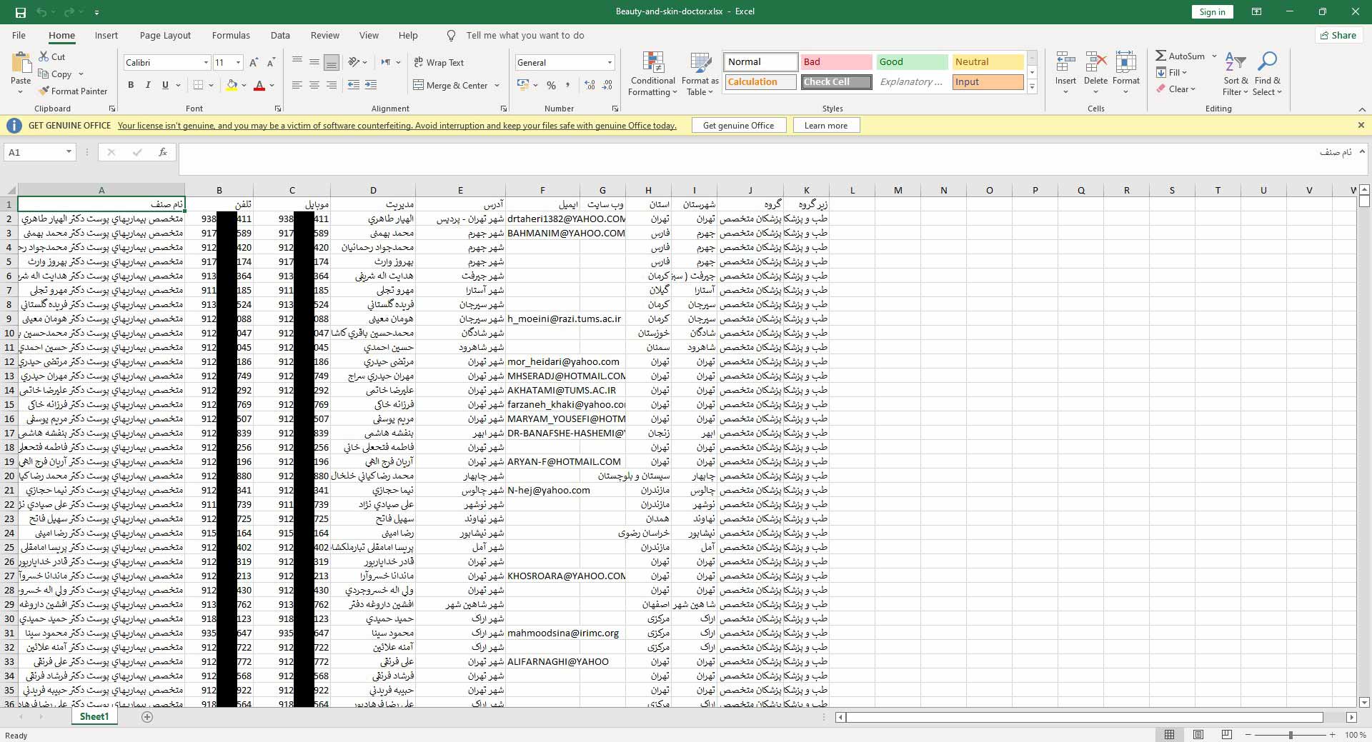 این فایل شامل اطلاعات کامل تمامی پزشکان زیبایی و پوست کشور از جمله شماره موبایل و تلفن ثابت، نام پزشک، آدرس، ایمیل، وبسایت، استان و شهرستان می باشد که از منابع اختصاصی Mobile BNK استخراج شده اند.