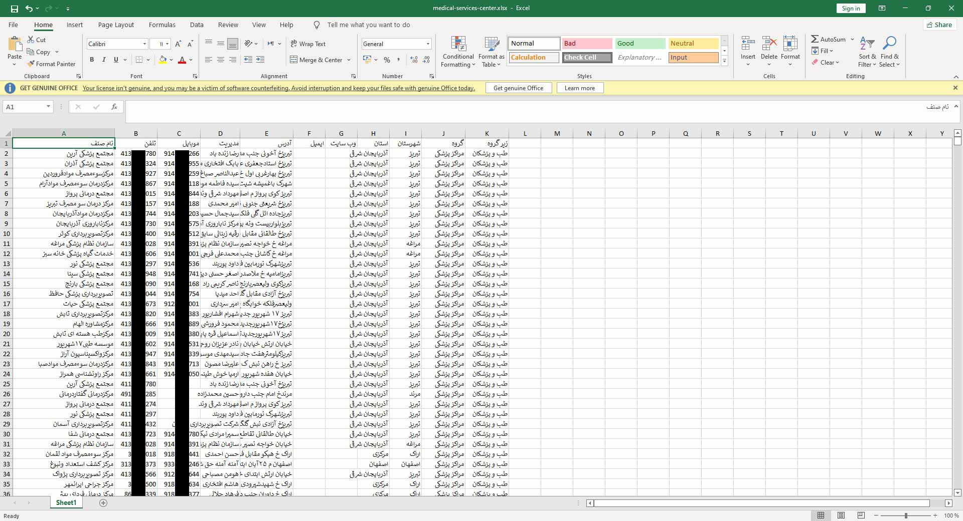 این فایل شامل اطلاعات کامل تمامی مراکز خدمات پزشکی کشور از جمله شماره موبایل و تلفن ثابت، نام مرکز، آدرس، ایمیل، وبسایت، استان و شهرستان می باشد که از منابع اختصاصی Mobile BNK استخراج شده اند.
